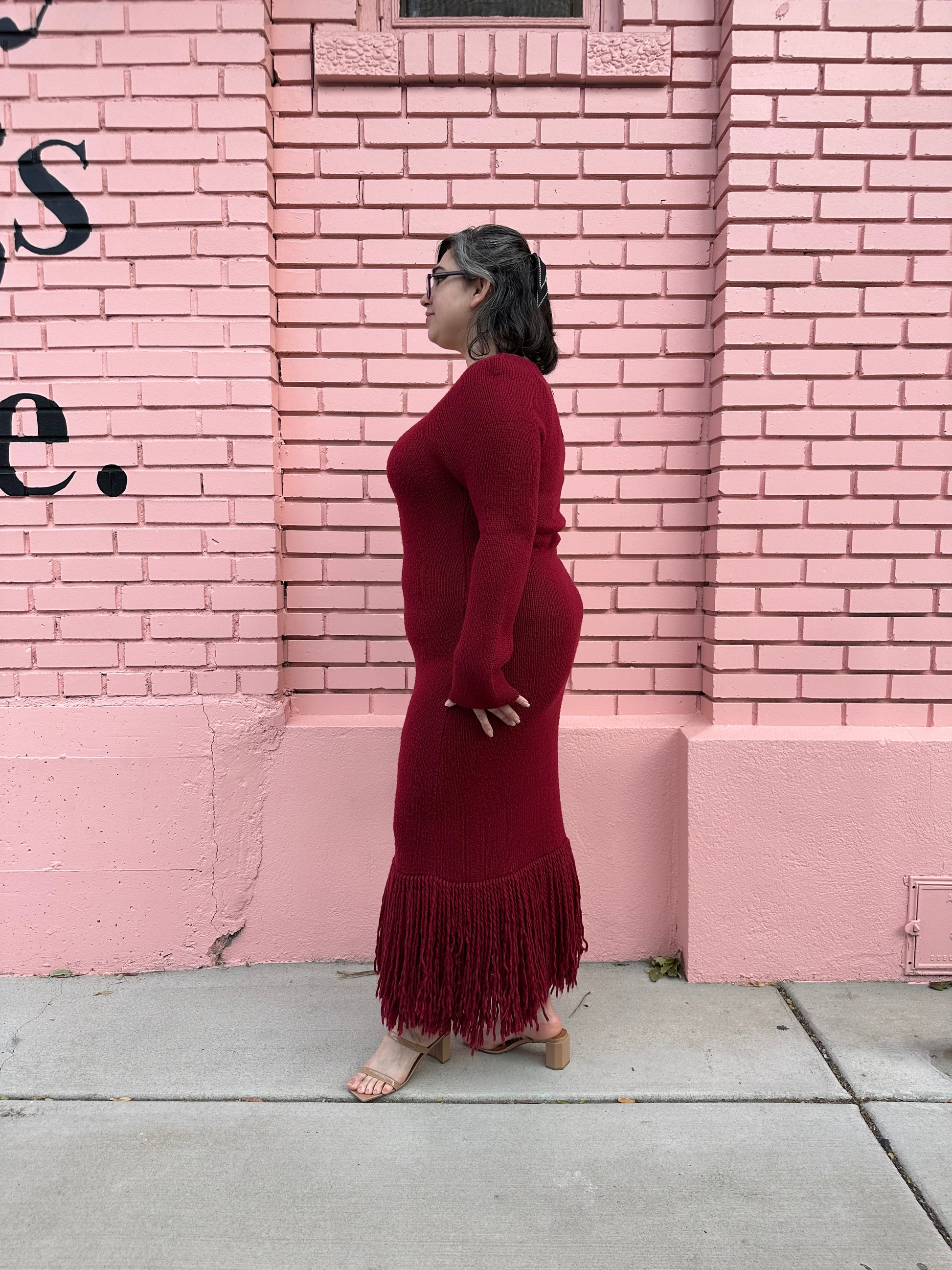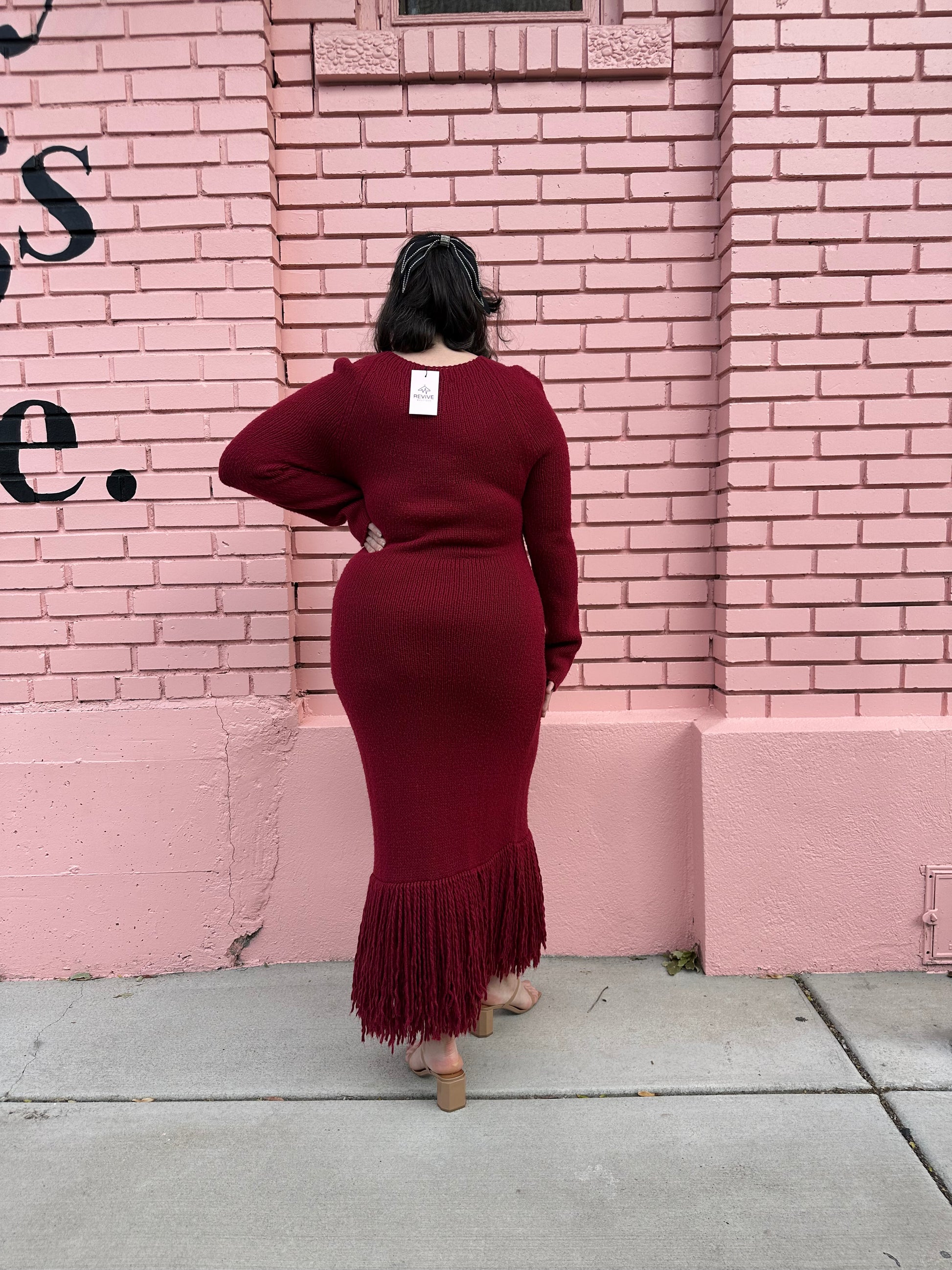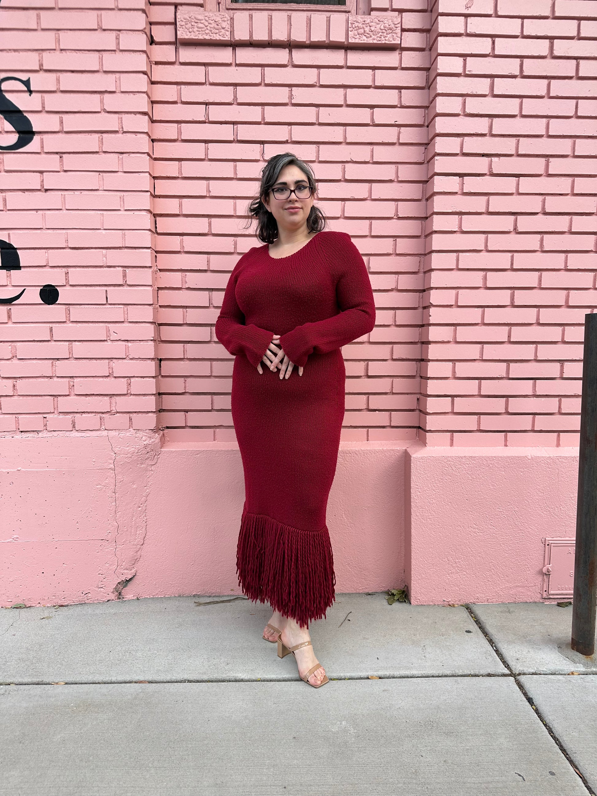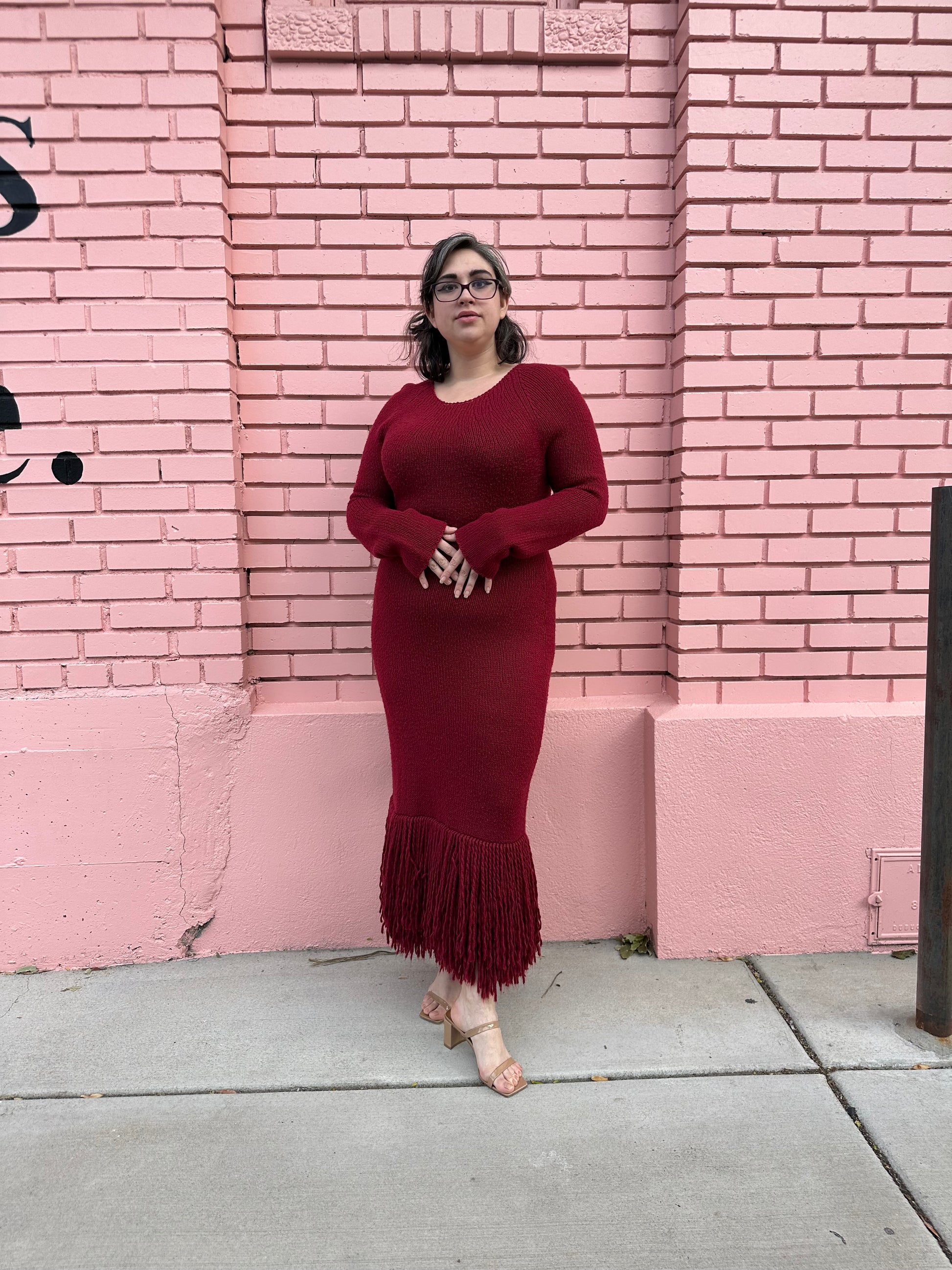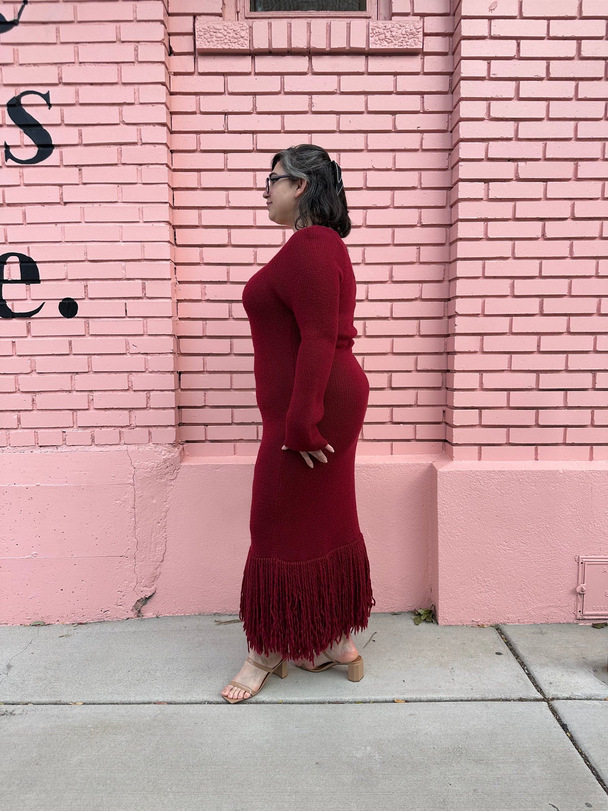 Warm, cozy, and super stylish! This Marina Moscone knit fringe gown scores perfect tens across the board. This stunning burgundy dress makes a one-of-a-kind holiday look for a casual dinner party with friends and will certainly be the highlight of the night.